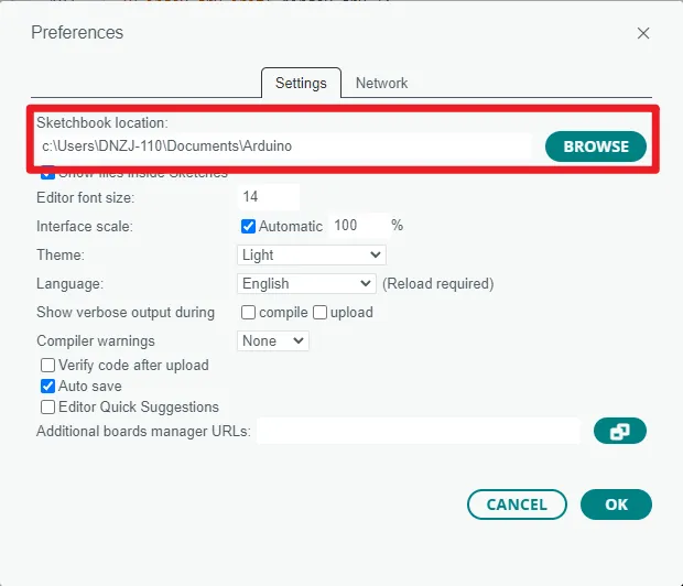 Then click "File" -> "Preferences" -> "Setting" to check the sketchbook location. Place the downloaded libraries in the sketchbook location.